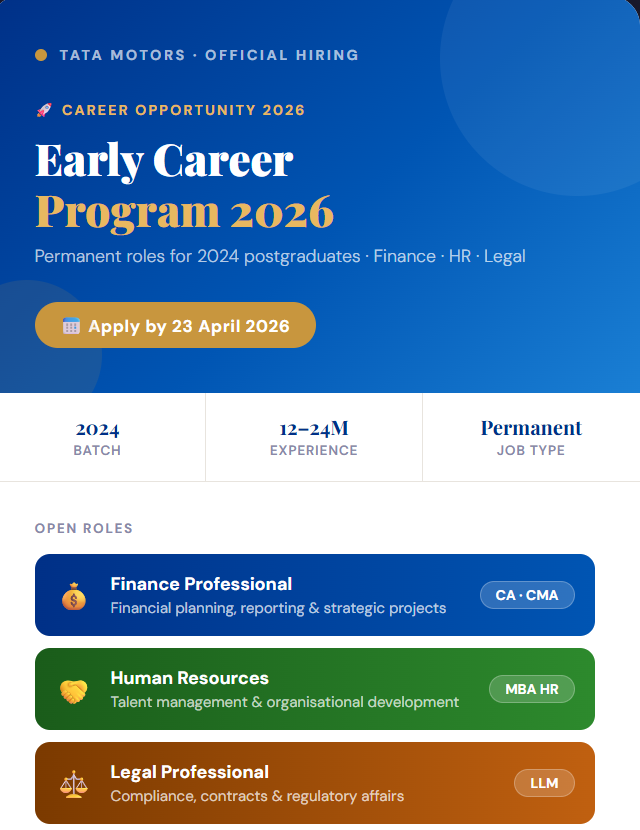 Freshers Jobs-2026Tata Motors Hiring 2026: Early Career Program | Freshers & 1–2 Year Experience Apply   Freshers Jobs-2026 Tata Motors Hiring 2026: Early Career Program | Freshers & 1–2 Year Experience Apply Read Post »